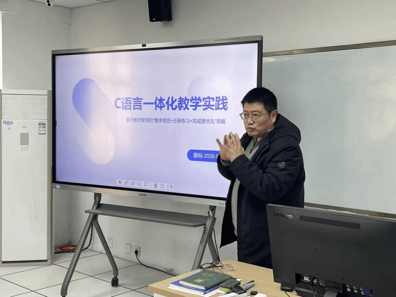 教学分享环节,路标教授以 “C 语言一体化教学实践” 为主题,针对课时有限痛点,提出 “先框架再细节,先做到再做好” 核心理念。他介绍,一体化教学将理论与上机实践融合,通过课前精准划分内容、课堂问题导向教学、课后分层练习,让学生在解决实际问题中掌握知识框架,高效推进教学进度。