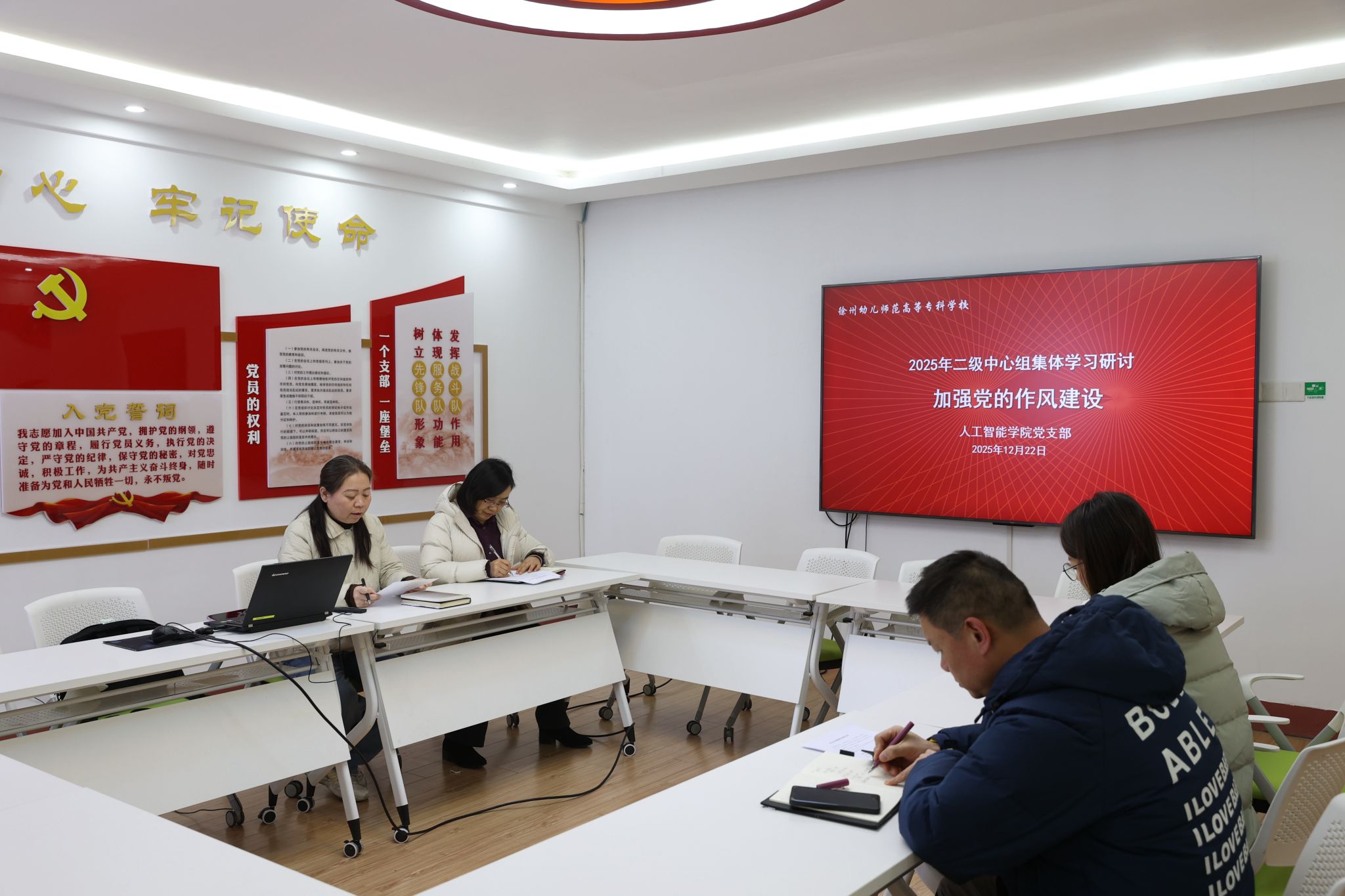 12月22日下午,人工智能学院党支部在崇师楼206会议室召开“加强党的作风建设”中心组集体学习研讨会。本次活动由党支部副书记陆霞主持,党支部支部委员成员参加活动,校党委委员、校图书馆馆长孙力进行巡学旁听。